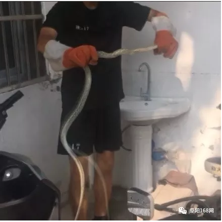 8月2日下午,阜阳市颍州区二里井东巷发现一条2米多长的大蛇,救援人员在群众的带领下来到大蛇的藏身地,大蛇受到惊吓躲进院子里洗手池的下水管里。 由于洗手池紧挨墙壁,作业空间小,救援人员决定把洗